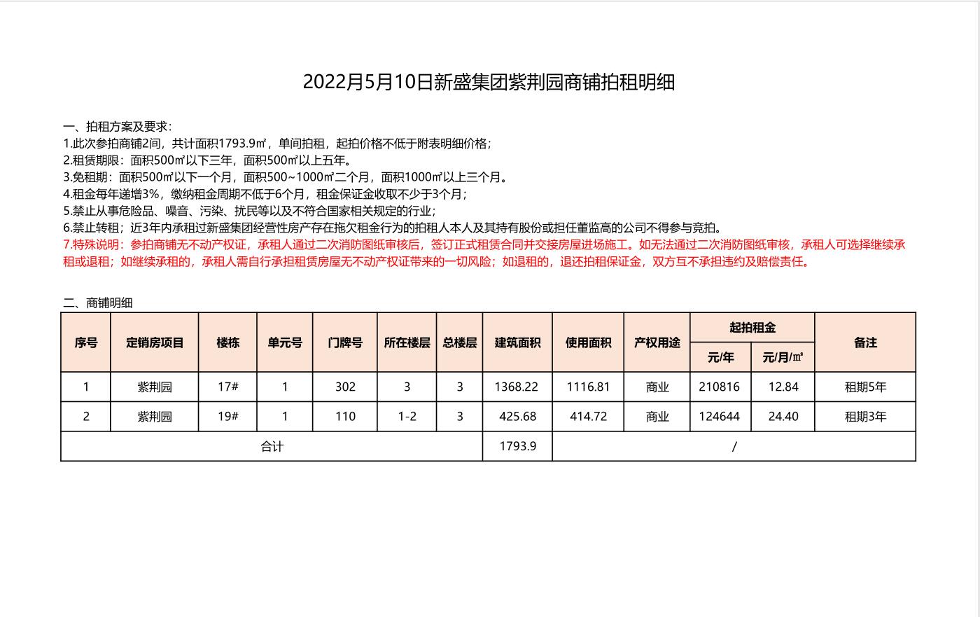 4、紫荊園17#-1-302室,建筑面積1368.228㎡,租期5年(保證金5萬元)。