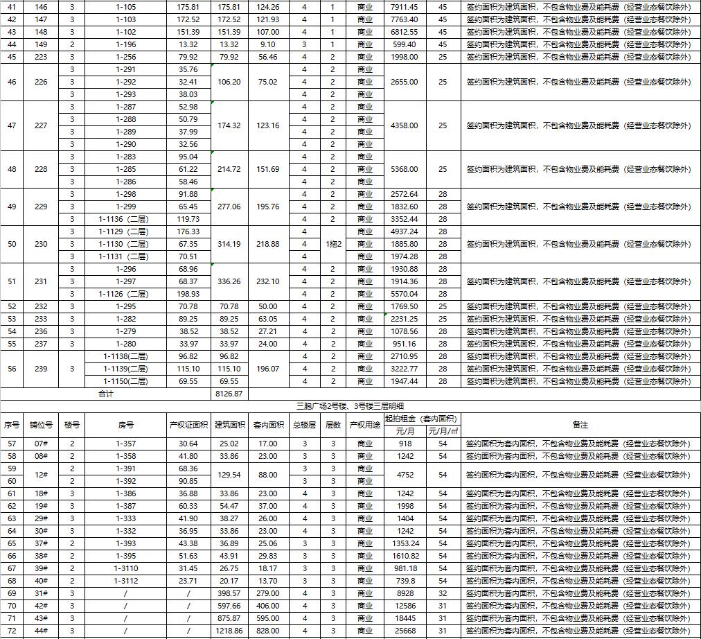 1.三胞廣場商鋪78處,面積分別為數(shù)十至數(shù)百平米不等,均為閑置。租期3-5年。