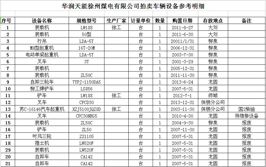 我公司受委托,定于2017年4月12日10時(shí)在徐州市中山南路55號(hào)7樓本公司大廳公開(kāi)拍賣(mài)華潤(rùn)天能徐州煤電有限公司各型車輛設(shè)備約二十余臺(tái),主要包括各型裝載機(jī)、叉車、起重機(jī)、鏟車、推土機(jī)、自卸車等。
