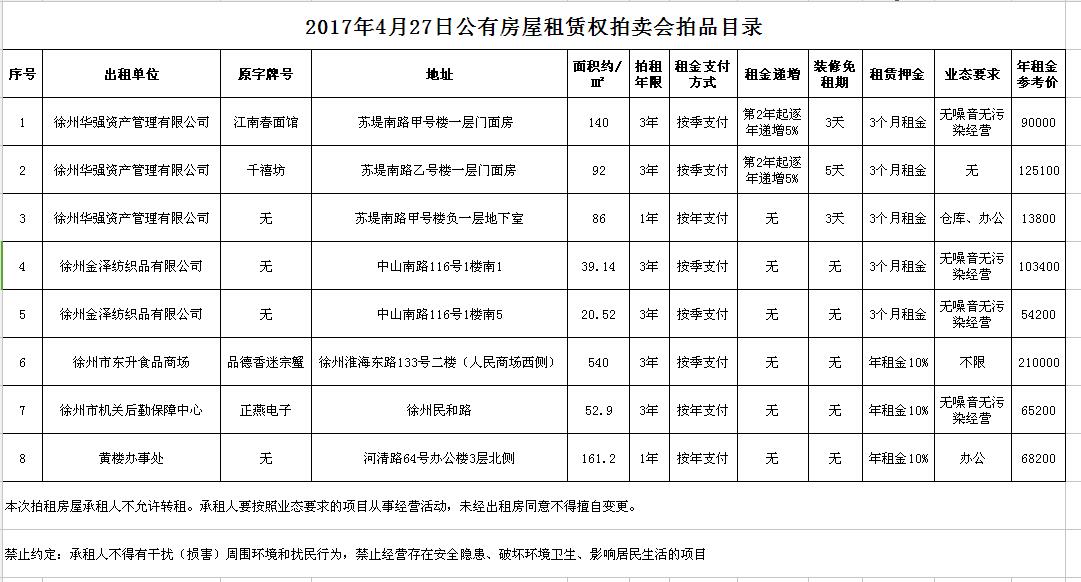 關(guān)注微信公眾號(hào)我公司受委托,定于2017年4月27日10時(shí)開(kāi)始,通過(guò)中國(guó)拍賣(mài)行業(yè)協(xié)會(huì)網(wǎng)絡(luò)拍賣(mài)平臺(tái)(http://pm.caa123.org.cn),以網(wǎng)絡(luò)競(jìng)價(jià)的方式公開(kāi)拍賣(mài)公有房屋租賃權(quán)一批,租賃期限均為3年,以下房屋均為空房: