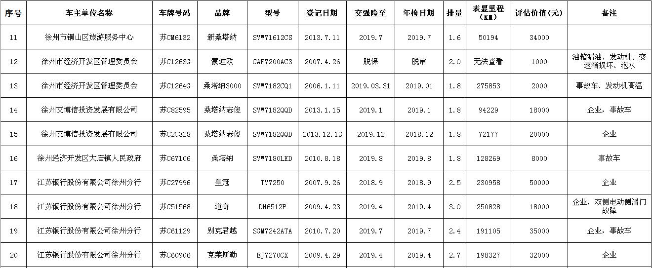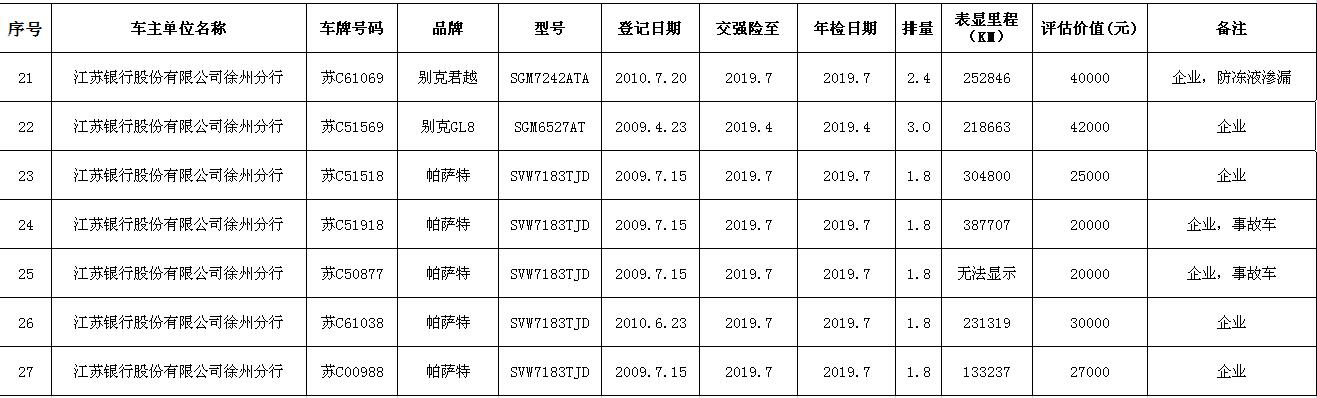 關注微信公眾號我公司受委托,定于2018年9月14日10時在中山南路55號三樓本公司拍賣廳公開拍賣:江蘇銀行股份有限公司徐州分行、徐州經濟技術開發(fā)區(qū)、銅山區(qū)、云龍區(qū)公務車輛二十余輛。主要車型有帕薩特、皇冠、道奇、別克、克萊斯勒等。