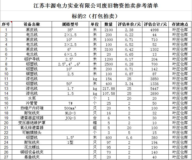 關(guān)注微信公眾號受江蘇徐供集體資產(chǎn)運(yùn)營中心委托,我公司將通過中國拍賣行業(yè)協(xié)會網(wǎng)絡(luò)拍賣平臺以網(wǎng)絡(luò)競價的方式分兩批公開拍賣其下屬三家集體企業(yè)廢舊物資,主要包括:廢舊電纜、纜芯、鋼帶、導(dǎo)線、開關(guān)、電表、金具、廚房設(shè)備等(詳見拍品目錄)。