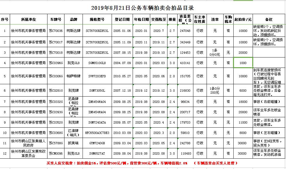 關(guān)注微信公眾號受委托,我公司定于2019年8月21日13:00時(shí)在徐州市銀地二手車交易市場四樓東南拍賣大廳通過現(xiàn)場和汽車街網(wǎng)絡(luò)拍賣平臺同步進(jìn)行的方式公開拍賣以下公務(wù)車輛: