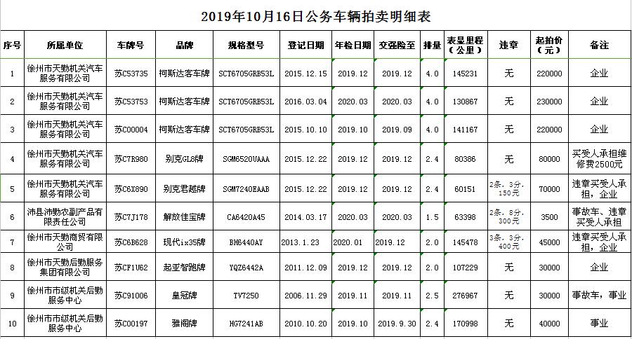 關(guān)注微信公眾號(hào)受委托,我公司定于2019年10月16日13:00時(shí)在徐州市銀地二手車交易市場(chǎng)四樓東南拍賣大廳通過現(xiàn)場(chǎng)和汽車街網(wǎng)絡(luò)拍賣平臺(tái)同步進(jìn)行的方式公開拍賣以下公務(wù)車輛: