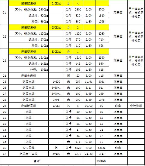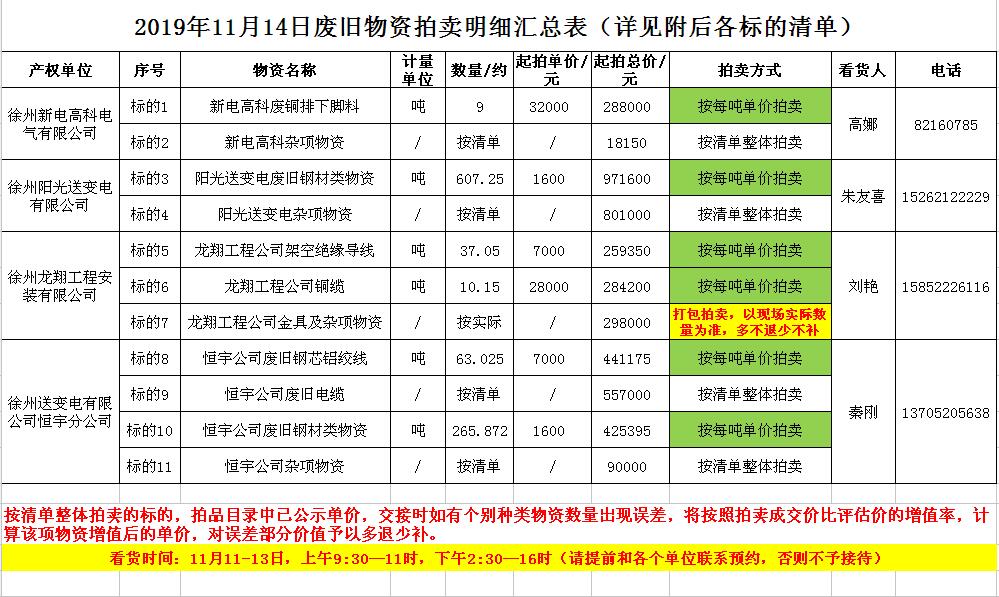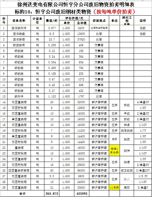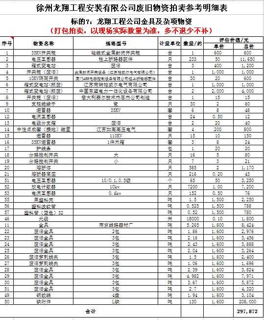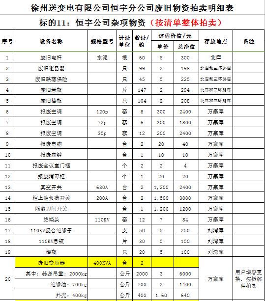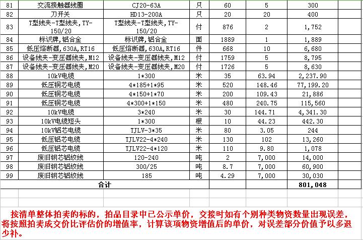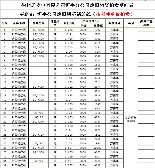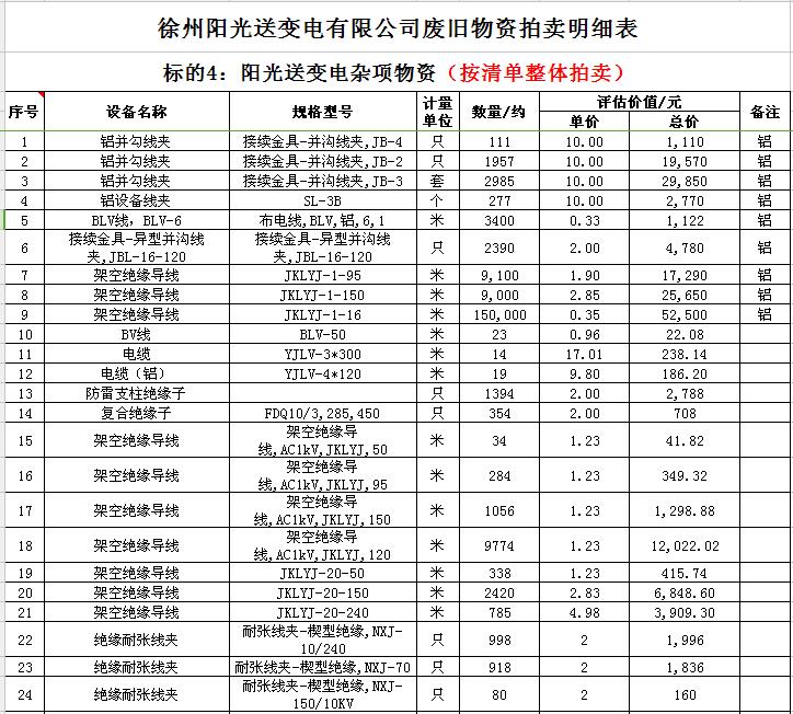 關(guān)注微信公眾號(hào)受委托,我公司將通過(guò)中國(guó)拍賣(mài)行業(yè)協(xié)會(huì)網(wǎng)絡(luò)拍賣(mài)平臺(tái)以網(wǎng)絡(luò)競(jìng)價(jià)的方式公開(kāi)拍賣(mài)以下公司廢舊電力物資。主要包含:廢銅排下腳料、廢不銹鋼、辦公設(shè)備等;架空絕緣導(dǎo)線、電纜、金具、角鋼塔、鋼芯鋁絞線、開(kāi)關(guān)、互感器、變壓器散件等。