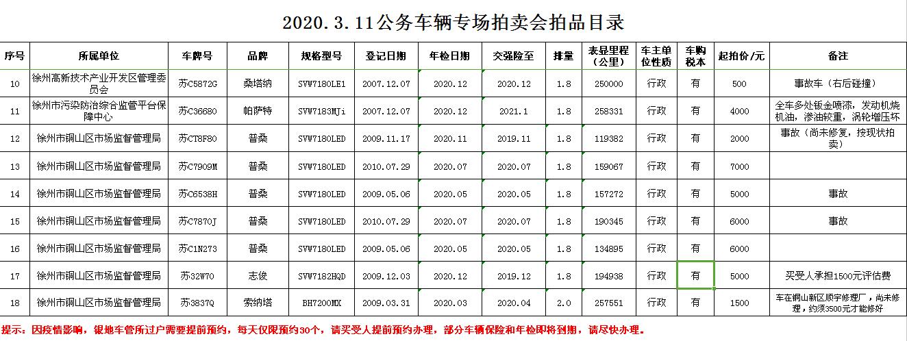 受委托,我公司定于2020年3月11日13:00時在徐州市銀地二手車交易市場四樓東南拍賣大廳通過現(xiàn)場和汽車街網(wǎng)絡(luò)拍賣平臺同步進行的方式公開拍賣以下公務(wù)車輛: