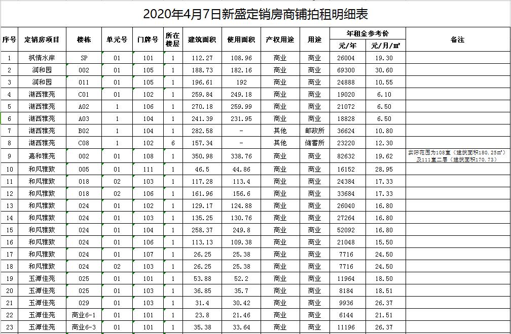 楓情水岸、潤和園、湖西雅苑、嘉和雅苑、和風(fēng)雅致、玉潭佳苑、文欣花園等。拍租商鋪約43套,均為空房,面積分別為數(shù)十至數(shù)百平米不等。租期3年。