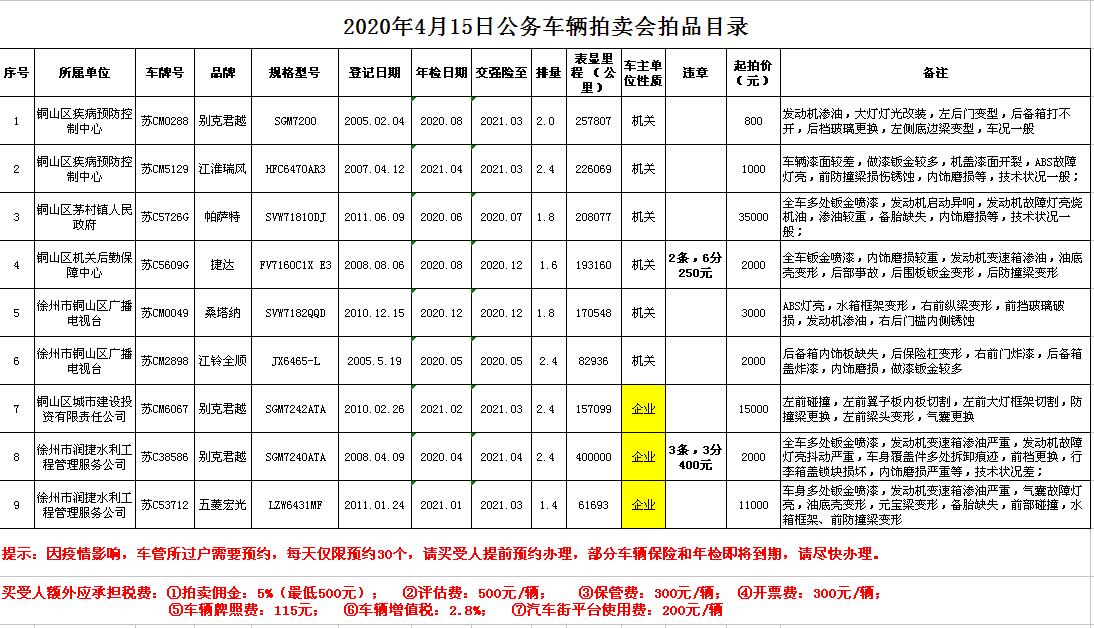 關(guān)注微信公眾號(hào)受委托,我公司定于2020年4月15日13:30時(shí)在徐州市銀地二手車交易市場(chǎng)四樓東南拍賣大廳通過現(xiàn)場(chǎng)和汽車街網(wǎng)絡(luò)拍賣平臺(tái)同步進(jìn)行的方式公開拍賣以下車輛:①05年蘇CM0288君越;②07年蘇CM5129江淮瑞風(fēng);③11年蘇C5726G帕薩特;④10年蘇CM6067君越;⑤08年蘇C38586君越;⑥11年蘇C53712五菱宏光;⑦08年蘇C5609G捷達(dá);⑧10年蘇CM0049桑塔納;⑨05年蘇CM2898江鈴全順。